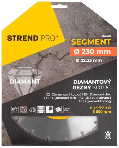 Diamantový kotouč Strend Pro je vhodný pro kutily i profesionální řemeslníky. Je vhodný pro řezání za sucha. technologie SEGMENT zajišťuje nejvyšší rychlost a vynikající chlazení čepele. Má široký rozsah použití - beton, žula, kámen, zdivo, cihly, železobeton a lze jej použít na obklady, dlažbu a střešní krytiny. Její průměr je 230 mm a maximální povolené otáčky jsou 6 600 ot/min.