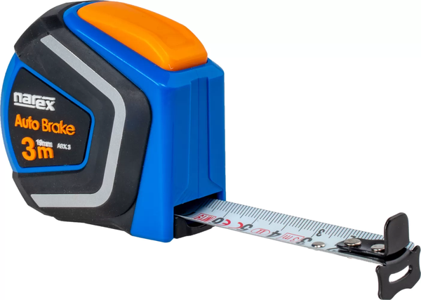 • Ergonomický svinovací metr NAREX je z pružného ABS plastu s pogumovanou úchopovou plochou a velkoplošným tlačítkem pro uvolnění aretace pásma