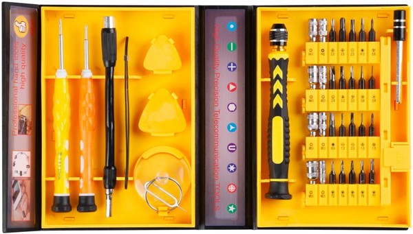 Sada hodinářských šroubováků ve žlutém roztažitelném kovovém pouzdře obsahuje - křížový šroubovák -1,5 mm,hvězdicový šroubovák - 0,8 mm, šroubovák s vyměnitelnými bity.matice pro šestihranné šrouby-2,5 -5,5 mm,bit pro vnější hlavu bitu PH2,bit Torx- T3-T15, plochý bit -1,5 mm,2 mm, křížový bit -1,2 mm,1,5 mm, 2 mm. Trojúhelníkový bit-2,3 mm, hvězdicový bit-0,8 mm, 1,2 mm, trojcípý hvězdicový bit-2 mm, plochý bit s drážkou-2,6 mm, nástavec na bity, dvě špachtle, pinzeta, přísavka, otvírák na SIM karty, pružný nástavec na bity.