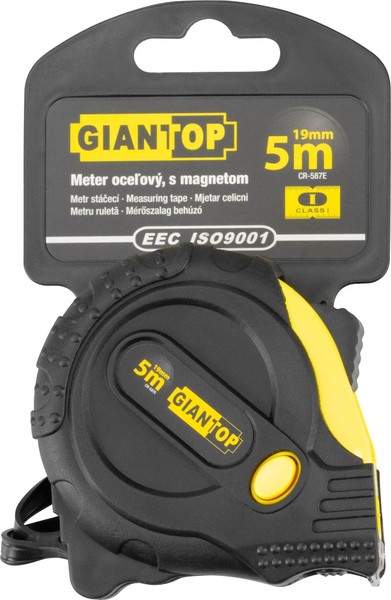 Klešťový měřič GIANT by neměl chybět ve výbavě profesionálních řemeslníků, ale ani kutilů. Tento pohodlný svinovací metr z vysoce pružné oceli je vybaven praktickou sponou na opasek a poutkem na ruku. Měřidlo má brzdu. pouzdro měřidla je vyrobeno z pevného plastu. Má kompaktní tělo a posuvný háček. Je vybaven magnetem. Jeho délka je 5 m a šířka pásu je 19 mm. Je vhodný pro měření v interiéru i exteriéru.