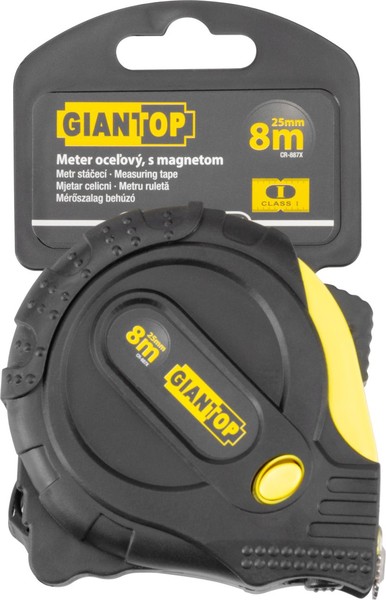 Klešťový měřič GIANT by neměl chybět ve výbavě profesionálních řemeslníků, ale ani kutilů. Tento pohodlný svinovací metr z vysoce pružné oceli je vybaven praktickou sponou na opasek a poutkem na ruku. Měřidlo je vybaveno brzdou. Pouzdro metru je vyrobeno z odolného plastu. Má kompaktní tělo a posuvný háček. Je vybaven magnetem. Délka metru je 8 m a šířka pásu je 26 mm. Je vhodný pro měření v interiéru i exteriéru.