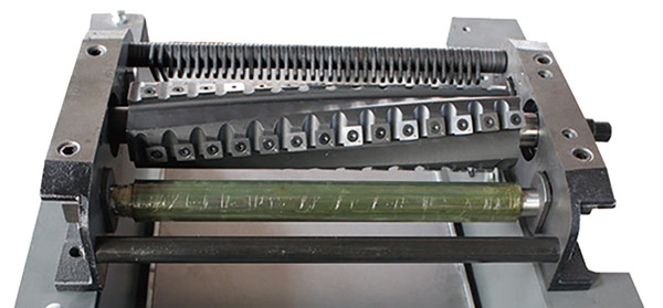 - Vstupní podávací válec s přímým ozubením a výstupní válec s pryžovým potahem pro rovnoměrný posuv bez poškození povrchu obrobku