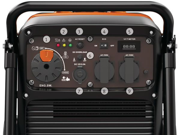 - Kontrolky výstupního napětí, přetížení a nedostatku oleje