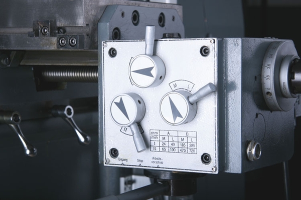 - Posuv pinoly pomocí tří pákových rukojetí (vrtání) nebo pomocí ručního kola jemného posuvu