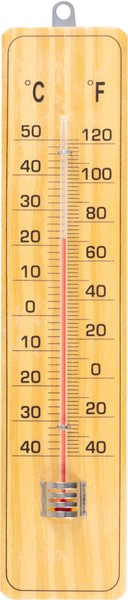 Venkovní teploměr s dřevěnou základnou, měří teplotu od 50 °C do -40 °C