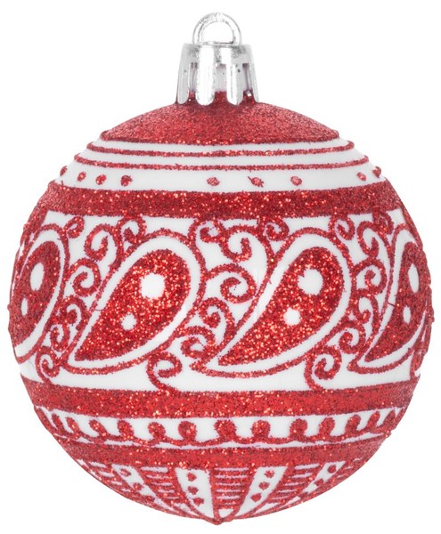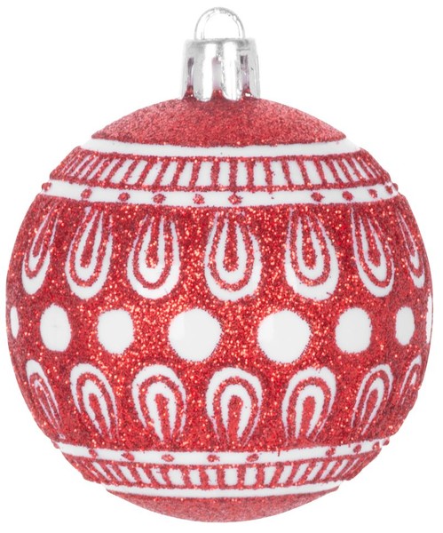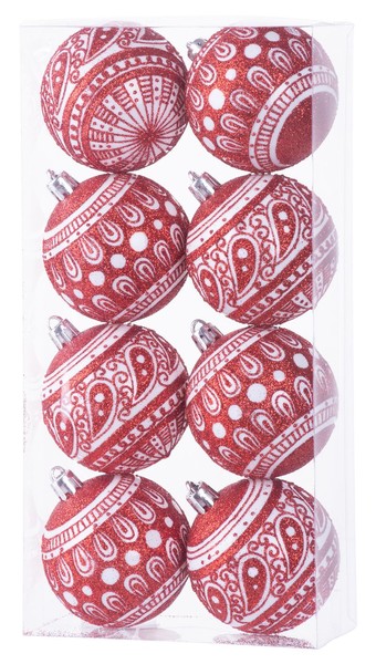 Sada ozdob na stromeček slouží ke slavnostnímu ozdobení vánočního stromku. Skládá se z 8 vánočních koulí s bílými ozdobami o průměru 6 cm. Barva koulí je červená. Jsou vyrobeny z plastu.