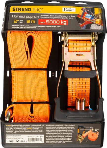 Upínací popruh Strend Pro má široké možnosti použití. Používá se k vázání zboží, navíjení konstrukcí, k ukotvení stanů, koncertních pódií apod. Jeho délka je 8 m, šířka popruhu je 50 mm a maximální nosnost je 5000 kg.