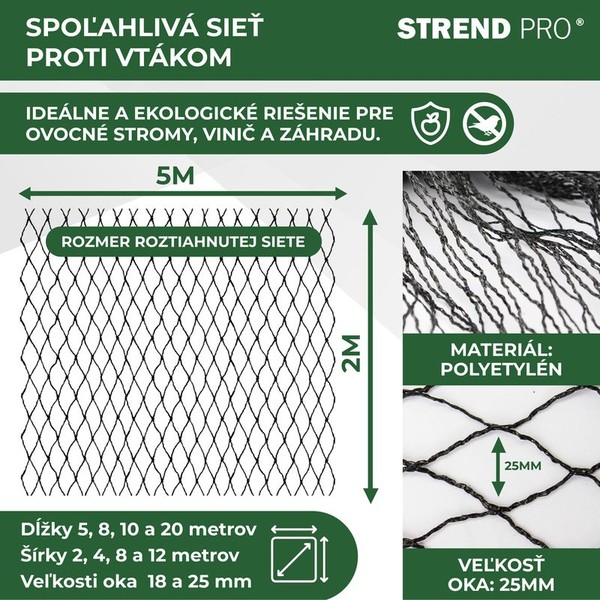 Určené k ochraně ovocných stromů, keřů a hroznů před ptáky. -Velikost oka:25 x 25 mm -Rozměry:2 x 5 m -Materiál:PE